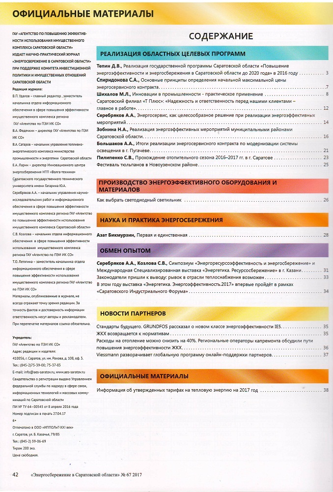 Издан 67 номер научно-практического журнала «Энергосбережение в Саратовской области», посвященный развитию строительного и жилищно-коммунального комплекса региона, основным результатам выполнения госпрограммы по энергосбережению, а также реализации мероприятий на основе энергосервиса.