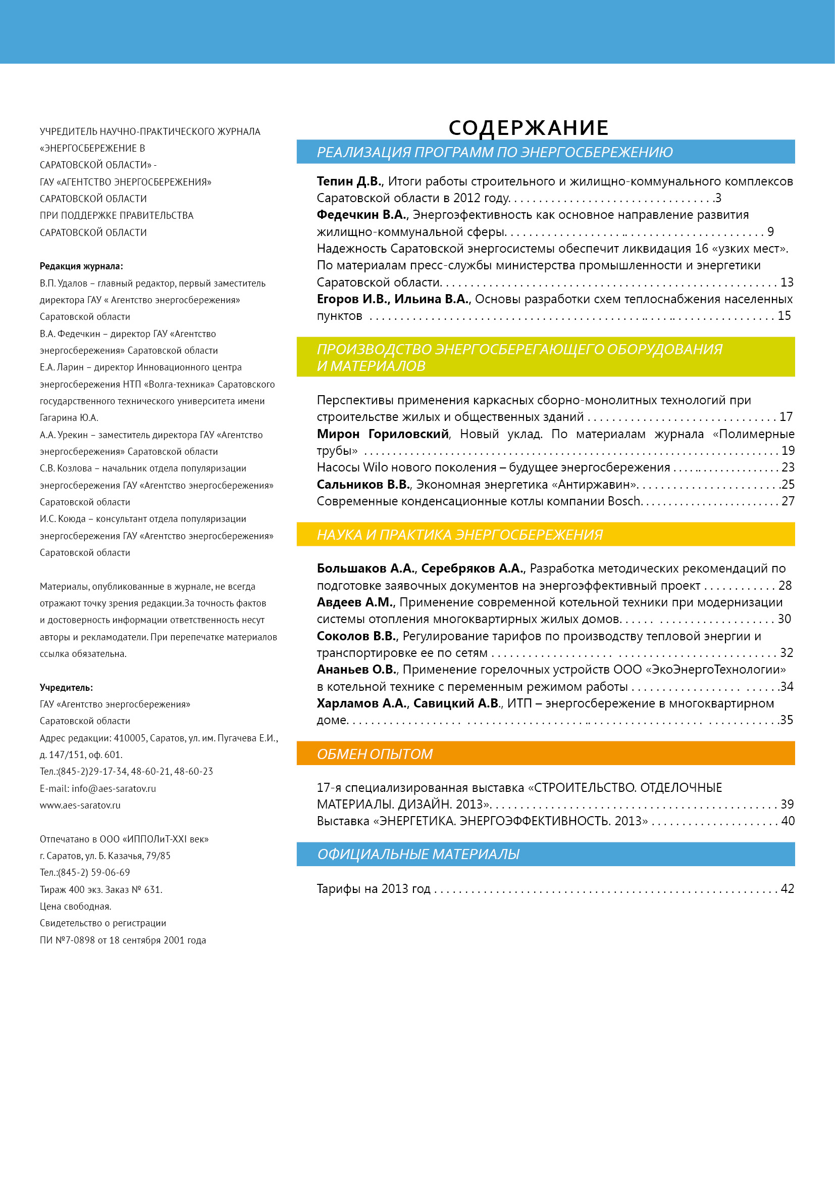 Вышел 1(51) 2013г. номер научно-практического журнала "Энергосбережение в Саратовской области
